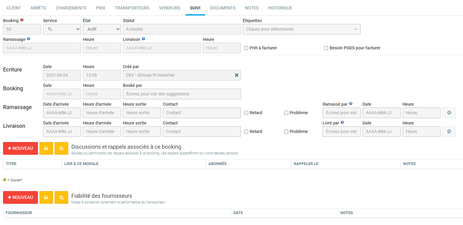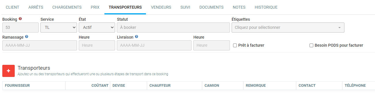 L'onglet Transporteurs sert à définir qui sera le transporteur qui effectuera le transport. Il est possible d'avoir plusieurs transporteurs sur un même booking, dans le cas ou il y a plusieurs arrêts. Dans le transporteur, vous pourrez définir pour quels arrêts précédemment configurés le transporteur sera utilisé.