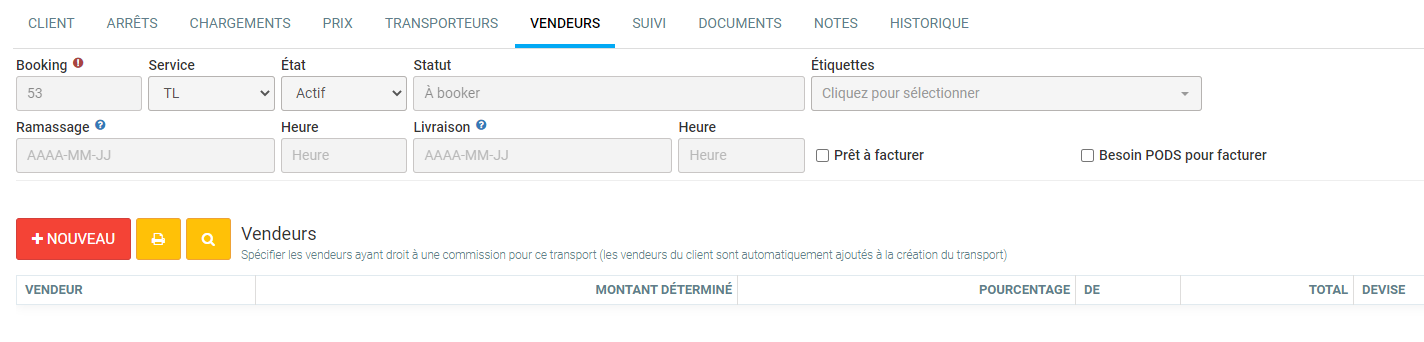 L'onglet Vendeurs affichera les commissions à verser pour ce booking. Les informations proviennent des configurations du client choisi pour le transport.