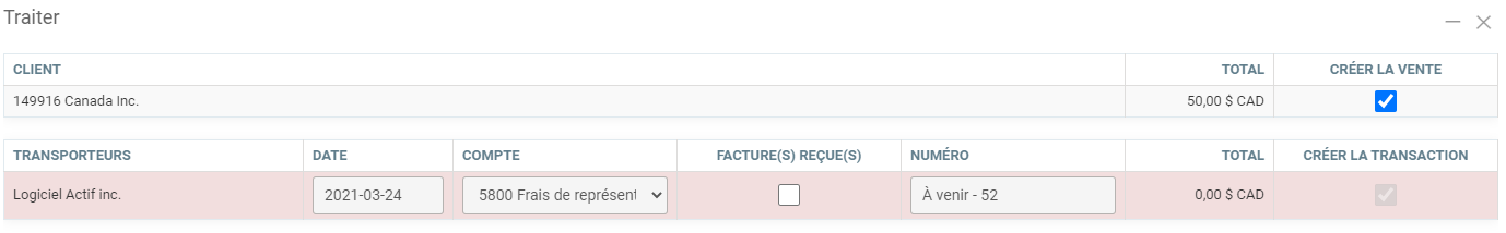 Pour en revenir à un transporteur externe, en cliquant sur "Traiter", une vente sera créée et il vous sera offert de faire un Appel à la facturation. C'est une transaction À venir - avec le no du Booking qui vous permettra de réceptionner la facture du transporteur externe quand vous la recevrez.
