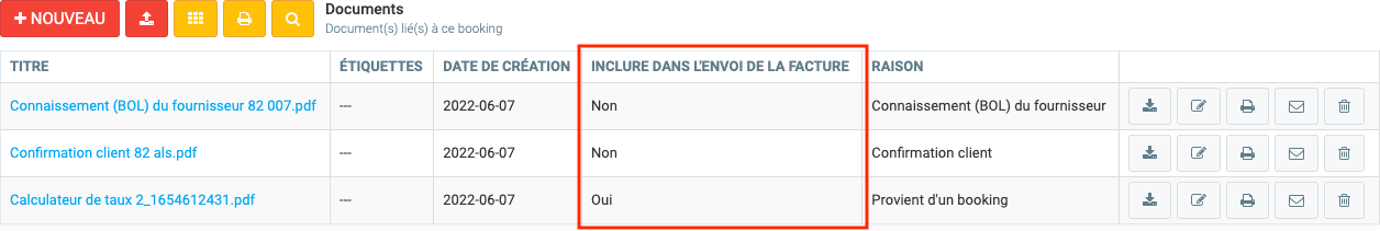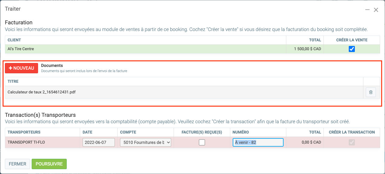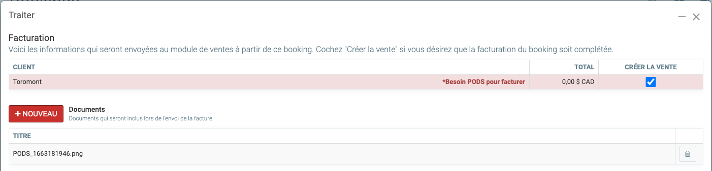 Note : Si vous avez déjà traité un booking et que vous ajoutez des documents à ce dernier, même si la case est cochée, les documents ne suivront pas automatiquement. Vous devrez appuyer de nouveau sur traiter à condition que la vente n'ait pas encore été convertie en facture.