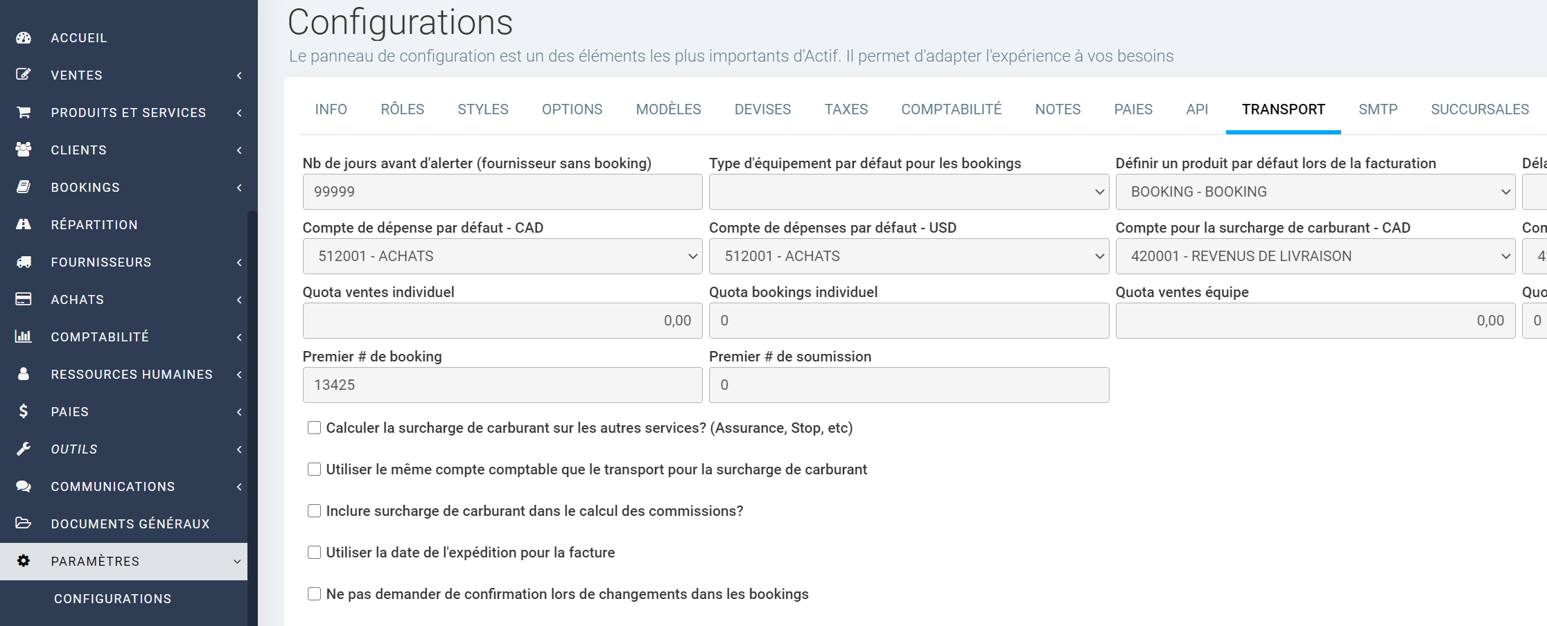 D'autres configurations propres aux modules de transports sont accessibles via le menu Paramètres > Configuration et dans l'onglet Transport. Dans l'onglet Comptabilité, profitez-en pour paramétrer vos comptes comptables principaux.