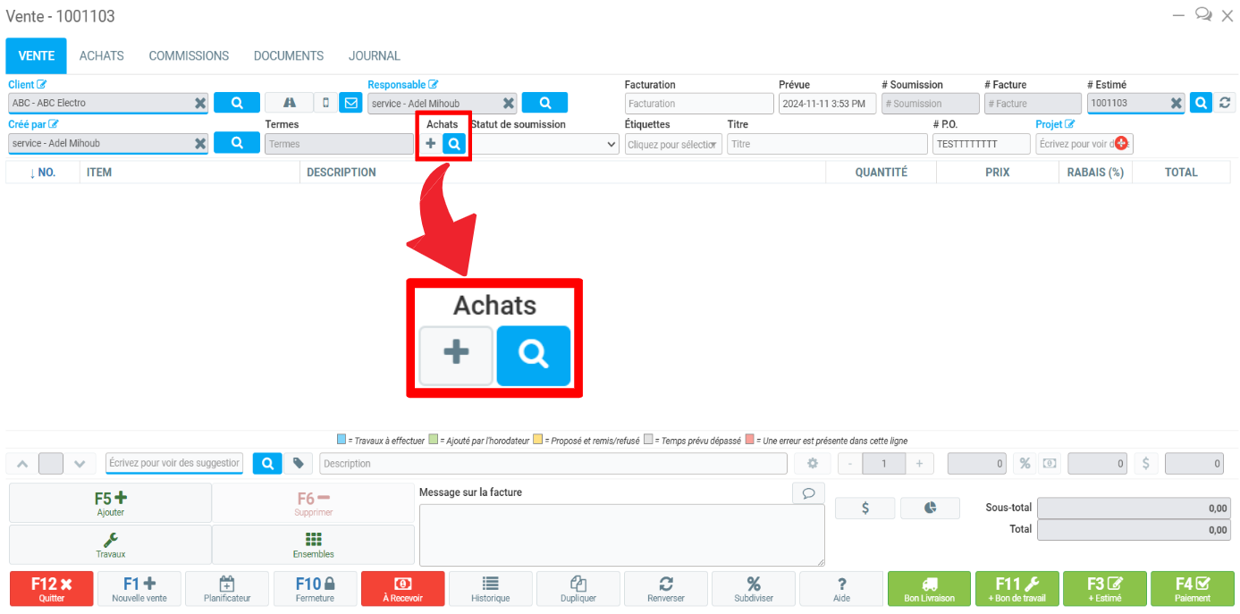 Pour créer un achat, dans le menu le Point de vente, cliquez sur Achats , entre Termes et Statut de soumission.