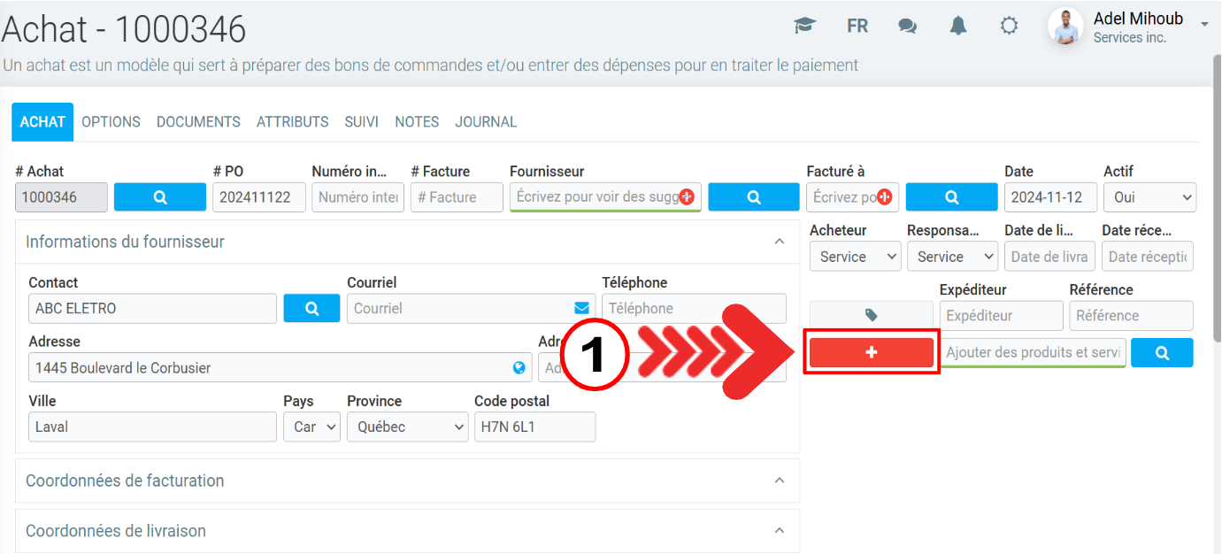 Si vous choisissez de créer un nouvel achat, après avoir cliqué sur le bouton +Nouveau, une nouvelle fenêtre d'achat s'ouvrira.