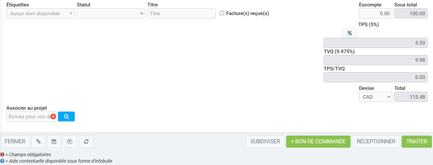 En bas de la page, à droite, vous trouverez les montants avec les taxes et les boutons suivants: