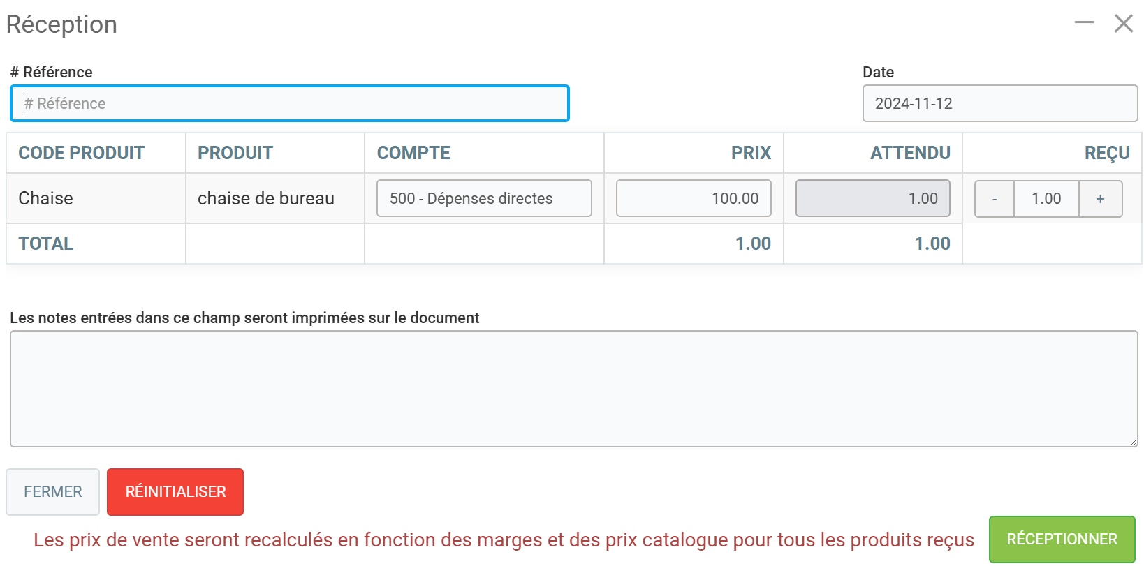Si vous cliquez sur le bouton Réceptionner, une autre fenêtre s'ouvre. Elle contient les informations suivantes: