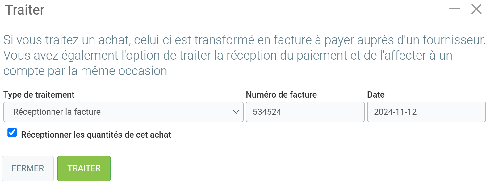 Cocher la case ou non "Réceptionner les quantités de cet achat", selon vos besoins.