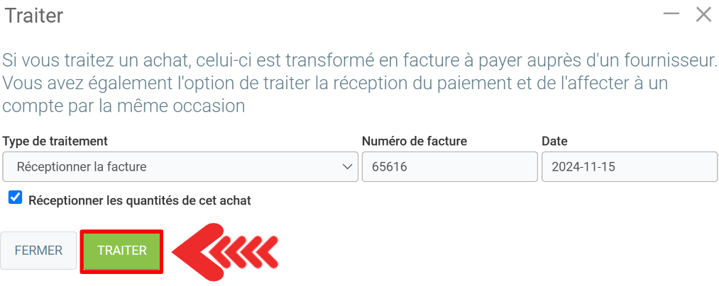 Dans la fenêtre suivante, vous devez indiquer le numéro de facture et cliquer sur Traiter.