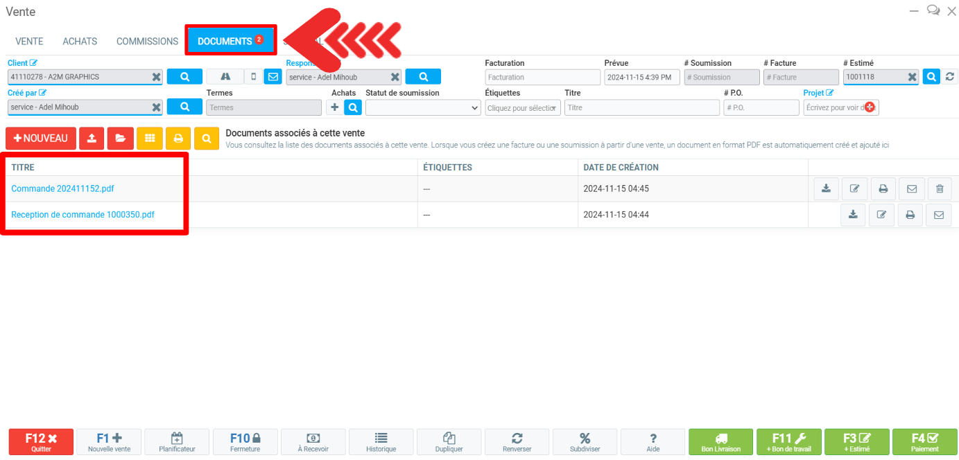 Les produits feront désormais partie de votre inventaire. Pour que les produits achetés apparaissent sur le bon de travail et dans l'estimé, ils doivent être inclus dans la vente au Point de vente. Le bon de travail, l'estimé et la facture sont accessibles à partir de l'onglet Documents.