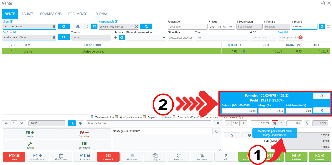 Pour modifier la marge sur le nouveau produit ou ajouter une autre marge additionnelle, cliquez sur le bouton de pourcentage % situé à côté du prix dans le coin inférieur droit du Point de vente.