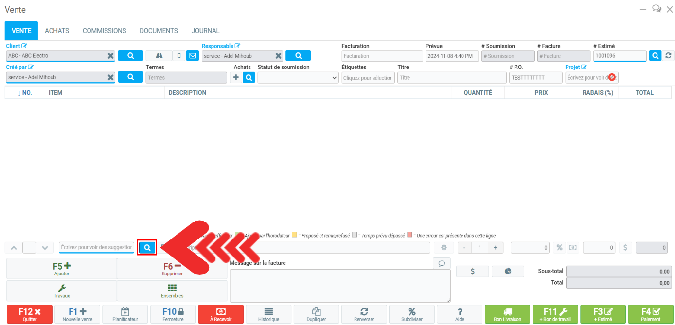 2. En bas à gauche dans le Point de vente, cliquez sur la loupe comme pour rechercher ou ajouter un Produit ou Service à votre facture: