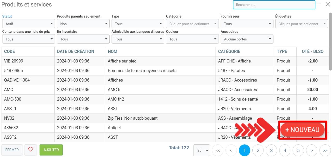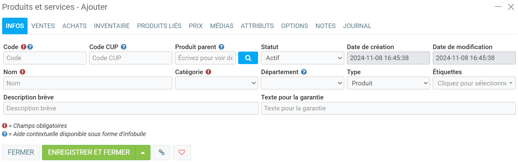 Cela ouvrira une fenêtre vierge permettant de créer un nouveau Produit ou Service.