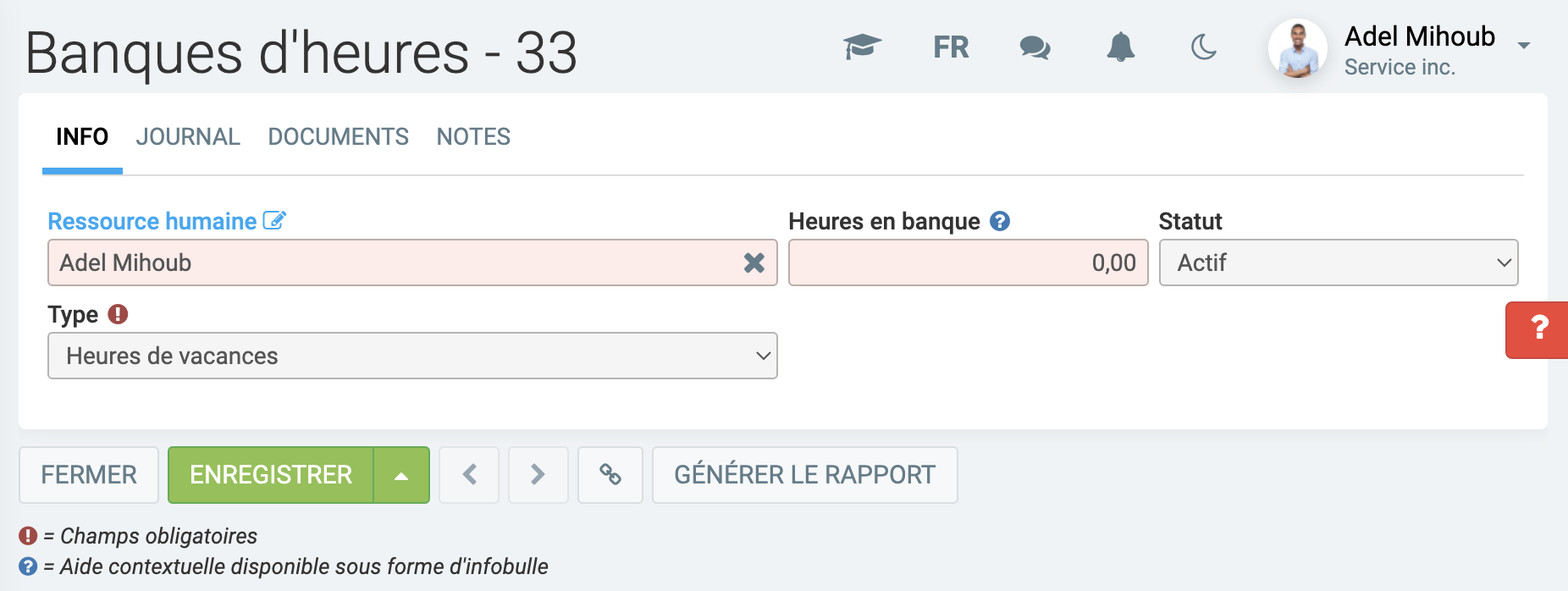 Vous pouvez en tout temps générer un Rapport de banques d'heures.