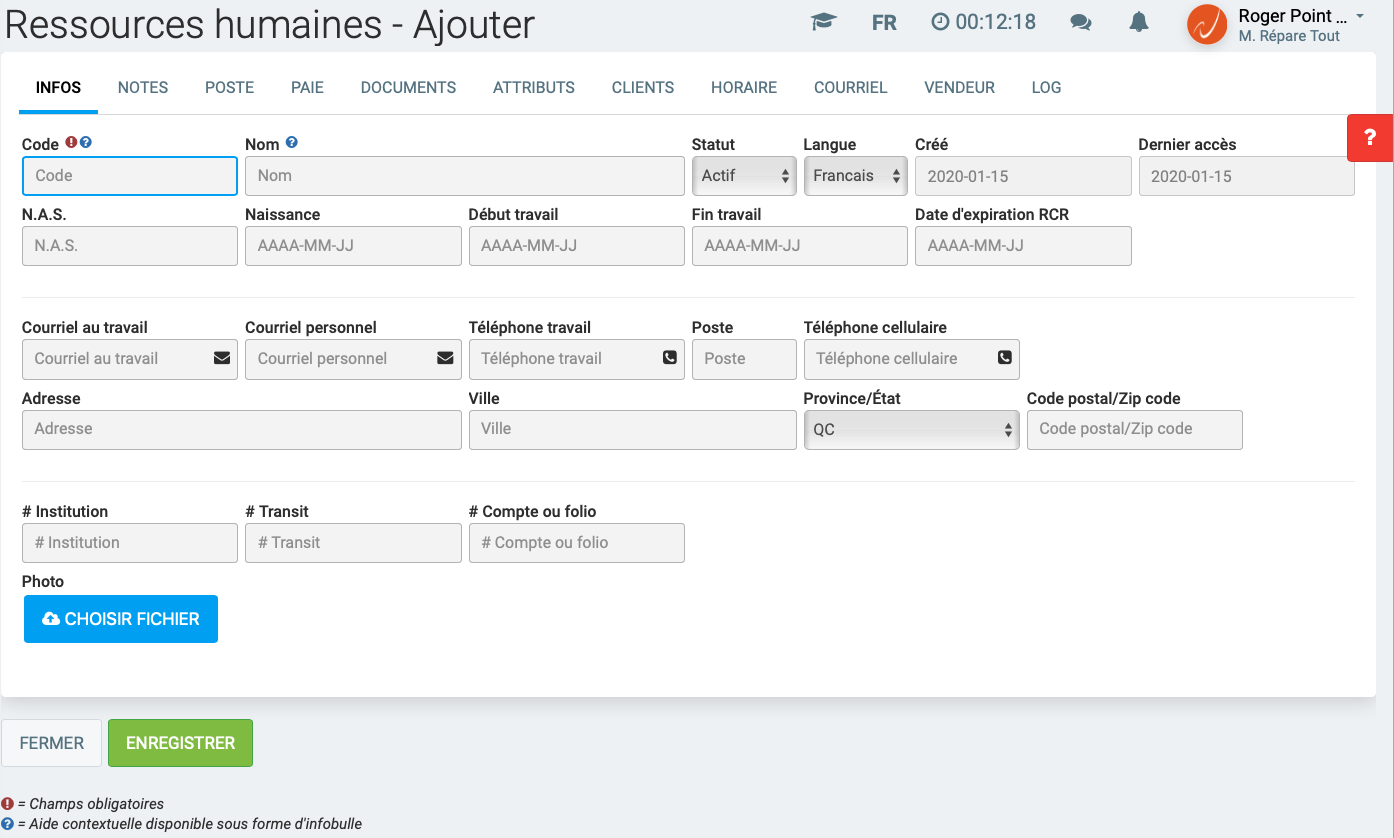 Vous avez maintenant terminé de remplir l'onglet INFOS de votre nouvelle fiche Ressources Humaines.