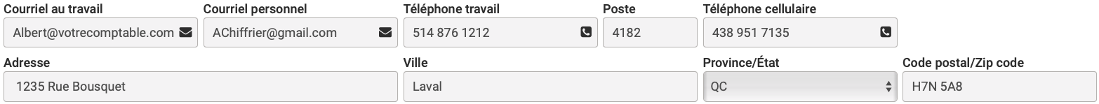 La section suivante de la fiche vous permet d'inscrire toutes les coordonnées vous permettant de communiquer avec cette personne, de même que celles relatives à l'adresse civique complète de cette dernière. Il est important de vous assurer de l'exactitude des informations que vous y entrerez.