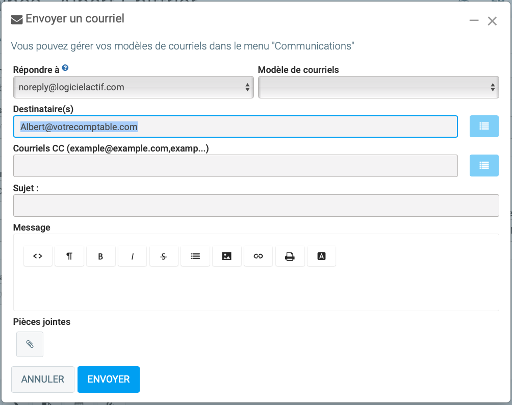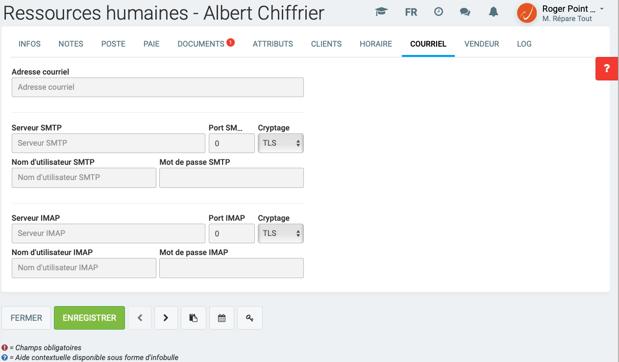 Cet onglet de votre fiche permet de créer une adresse courriel appartenant à l'entreprise et qui sera réservée à l'utilisation exclusive par cette ressource humaine. L'avantage qui en résulte est de permettre l'archivage des échanges courriel entre votre ressource humaine et tous ceux avec qui elle correspond, aussi bien les courriels envoyés depuis cette adresse que ceux reçus à cette même adresse.