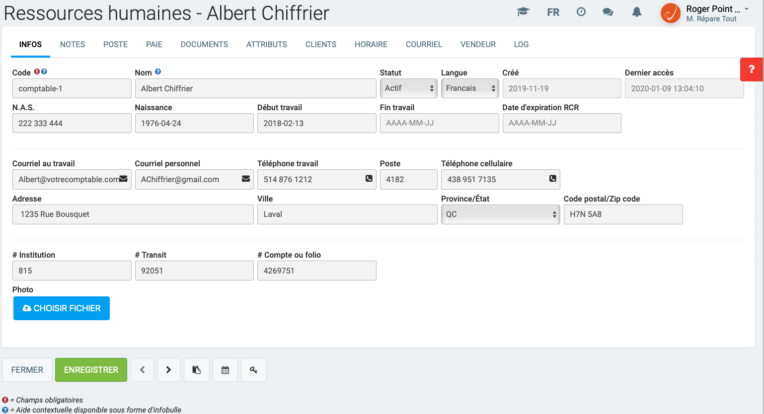 - Une ressource humaine, qui travaille pour vous à titre d' "Employé". Dans un tel cas, le paiement de ses services figurera sur votre liste de paie (payroll) et sa fiche complète devra être remplie avec toutes les données nécessaires par le personnel de votre service de paie.
