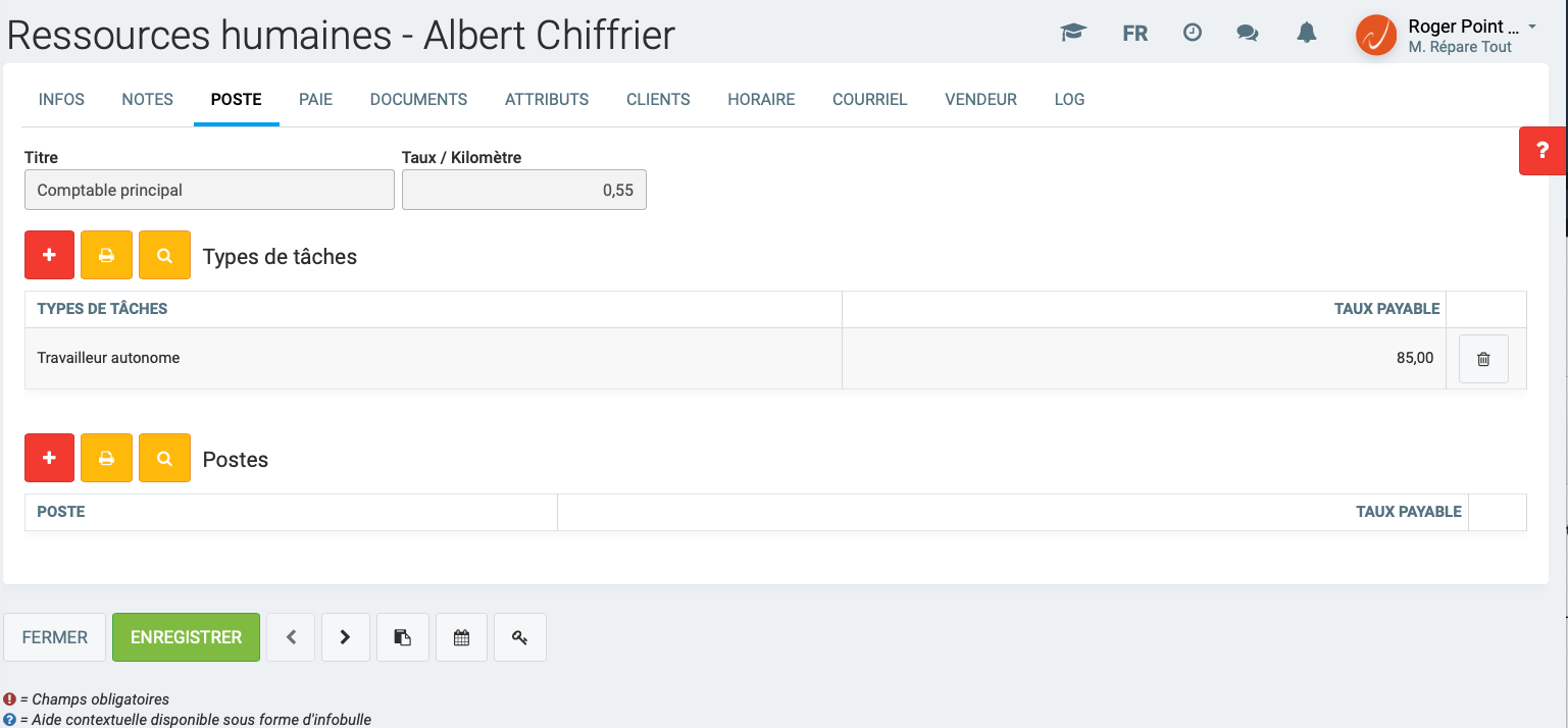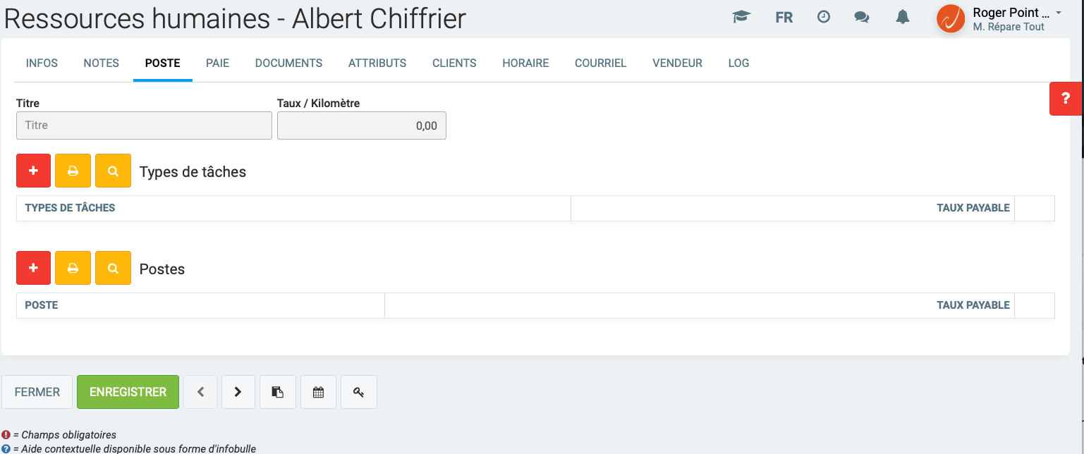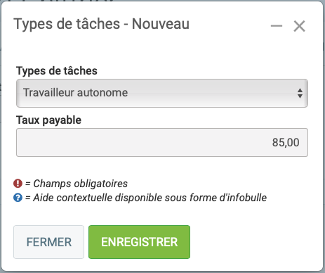Dans la section "Types de tâches", vous pourrez définir chacune des diverses tâches que cette ressource humaine est appelée à effectuer à l'intérieur de son mandat au sein de l'entreprise et y indiquer le taux payable convenu pour chacune d'elles.