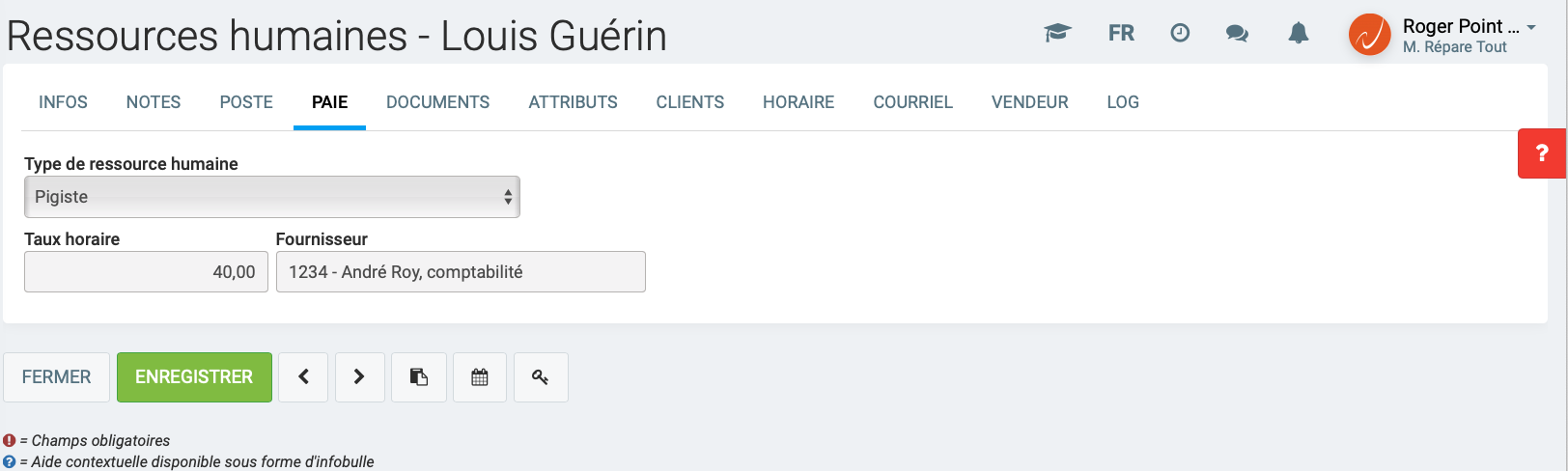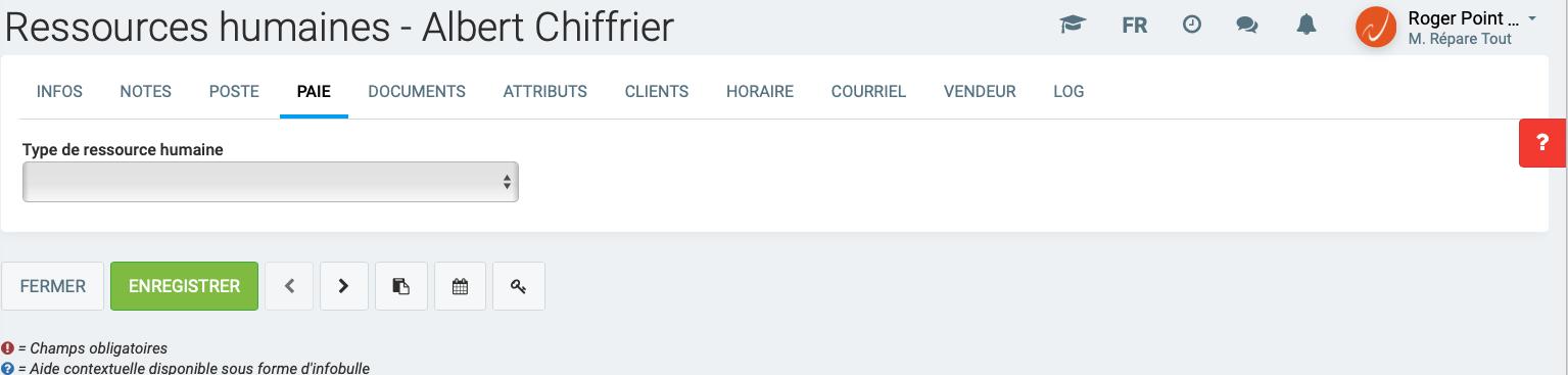 dans la liste déroulante du champ "Type de ressource humaine" et l'onglet PAIE de sa fiche ressemblera à ceci.