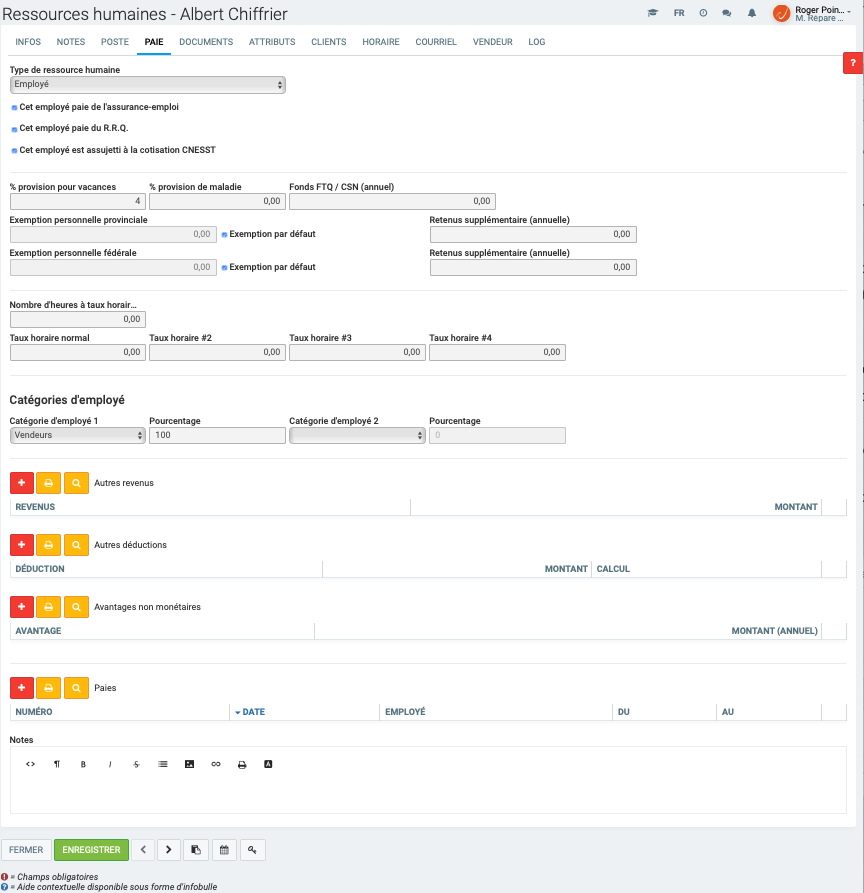NOTE : Cet onglet apparaîtra sur votre fiche Ressources Humaines uniquement si vous souscrivez un abonnement au "module" PAIE et que l'entreprise se charge elle-même de produire les paies de chacun de ses employés, plutôt que de recourir à la solution que constituent les divers services de paie contractuels disponibles.