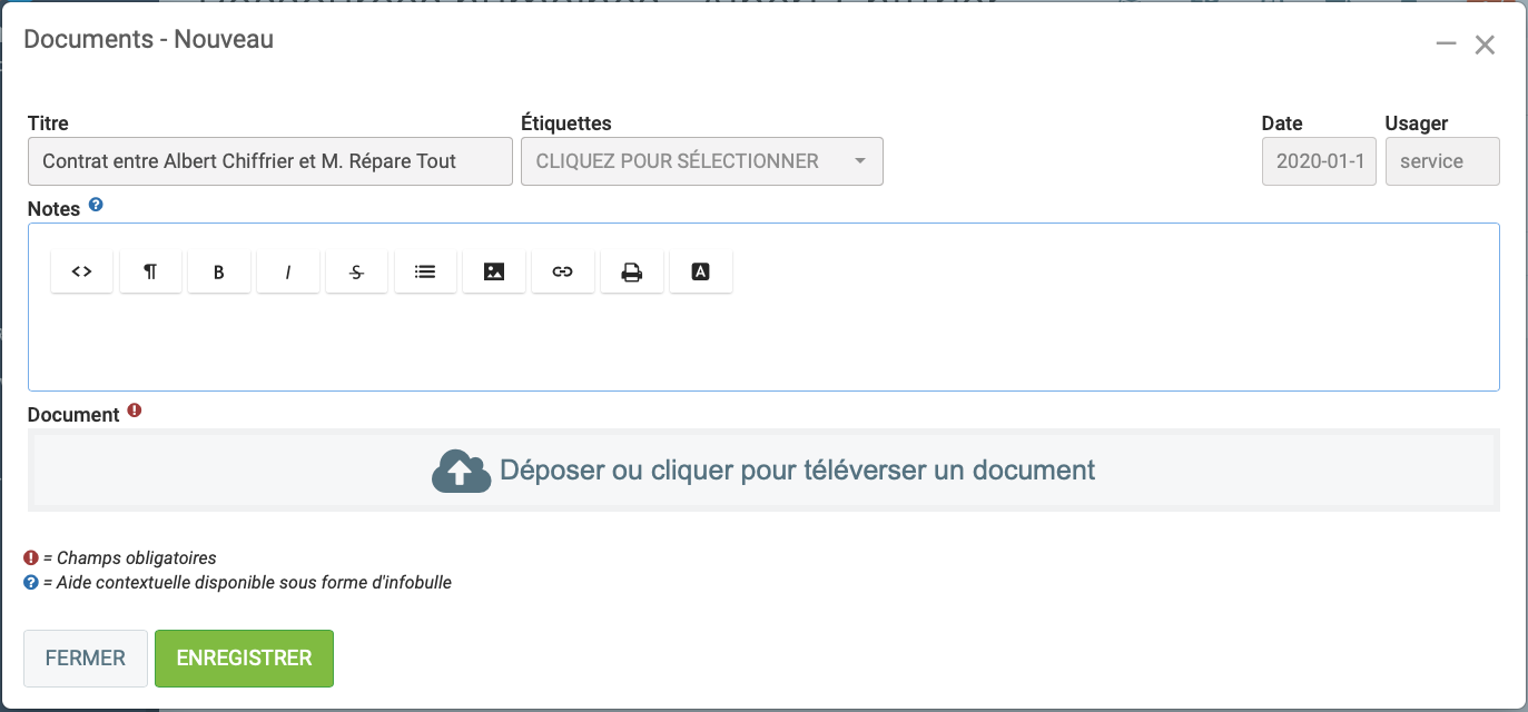 , une Note (facultative), puis glisser et déposer le document ou encore le sélectionner depuis votre explorateur, en cliquant dans le champ "Document"