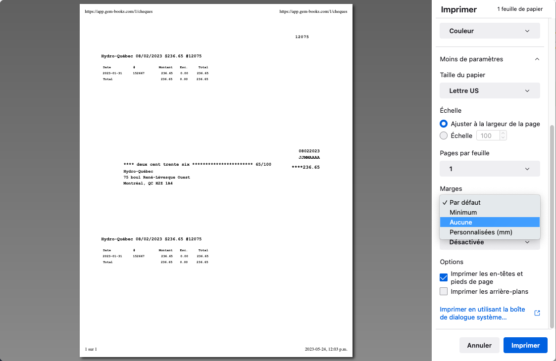 Lorsque vous faites une impression de chèques, si votre navigateur ajoute des marges à l'impression, assurez-vous de cocher l'option "Aucune marge" avant d'imprimer.