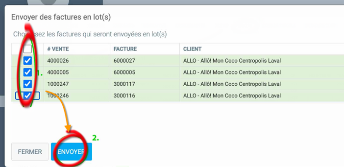 Une liste des factures du client apparaît. Cochez les factures que vous désirez lui envoyer par courriel et cliquez sur Envoyer.