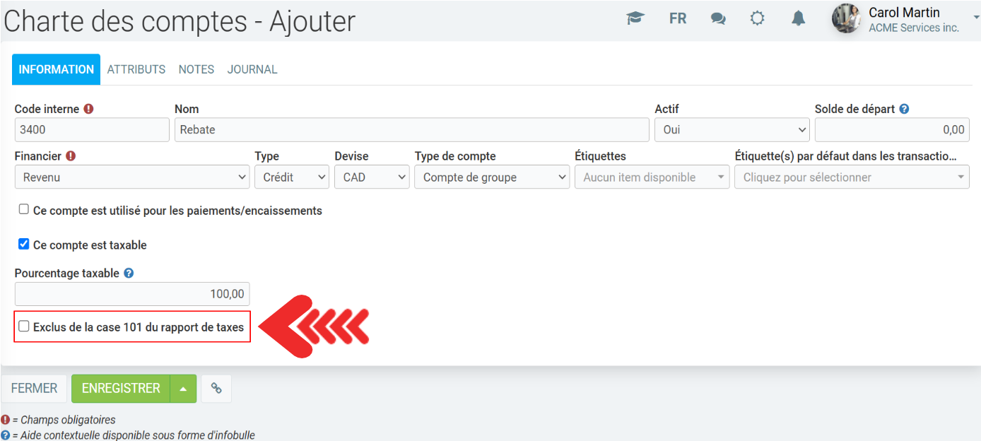 Au Québec, la case 101 s'appelle "Chiffre d'affaires". Parfois, dans cette case, certains comptes de revenus ne doivent pas apparaître. (Par exemple, des comptes de subventions) Avant de cocher un tel compte, demandez à votre comptable. Si vous êtes normalement en affaire, que vous vendez des choses taxables et non taxables, le chiffre d'affaires (Case 101) devrait normalement avoir le total de toutes vos ventes (sauf selon la méthode simplifiée)