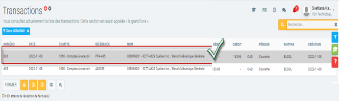 Par le module des transactions au grand livre, faites une recherche en entrant le nom du client et en cliquant sur l’icône du filtre.