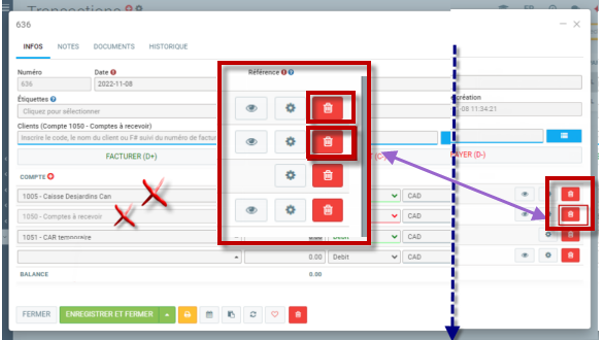 - Cliquez sur l’icône de la poubelle à droite dans les transactions,