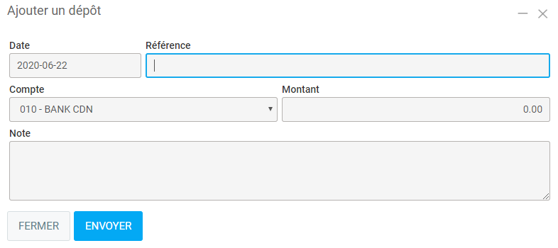 Vous pouvez préciser la date du dépôt (par défaut aujourd'hui), la référence à donner à l'écriture comptable, vers quel compte comptable est-ce que le dépôt est envoyé (méthode de paiement si le module magasin est activé) et le montant du dépôt.