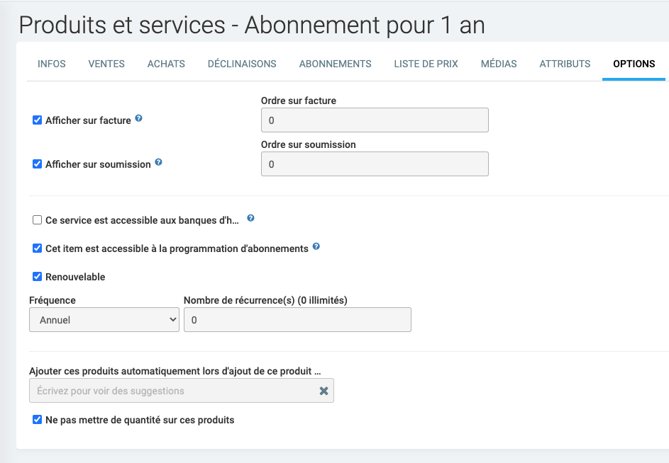 Le produit ou services que vous voulez utiliser pour les abonnements doit avoir l'option "Cet item est accessible à la programmation d'abonnements" cochée dans l'onglet "Option" de la fiche du produit.