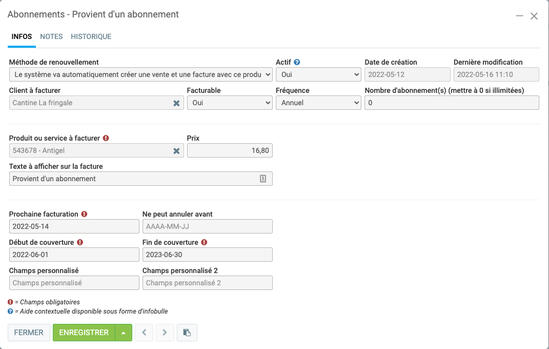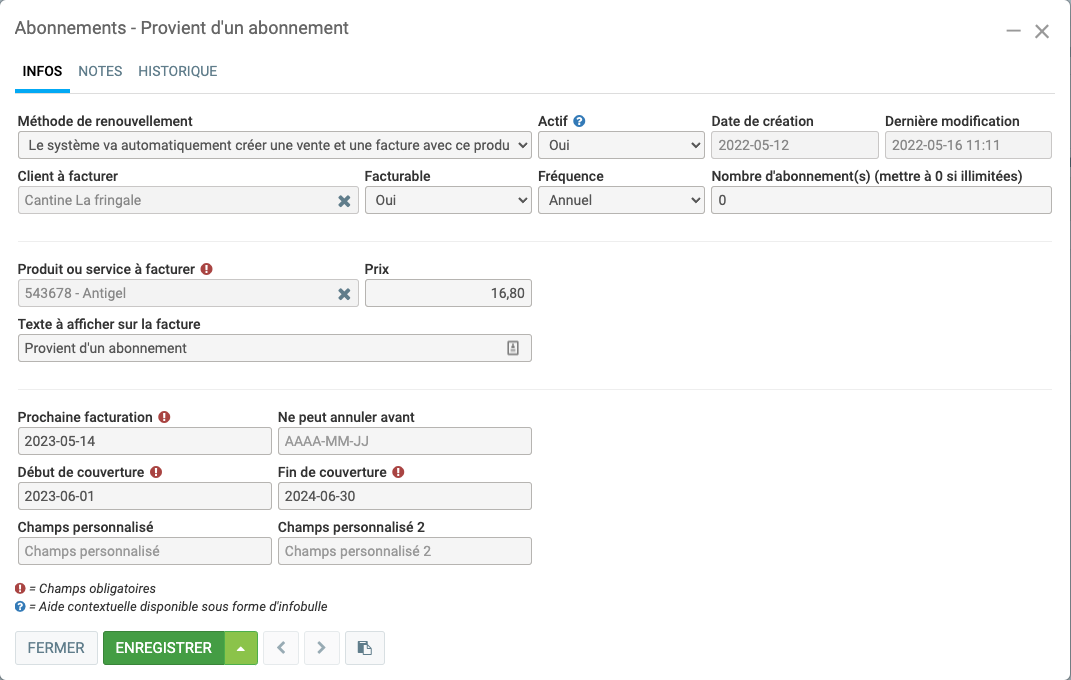 À noter que le système a ajouté 1 an aux trois dates avant de générer la vente. Si vous ouvrez l'abonnement le 16 mai 2022, vous obtiendrez ceci :