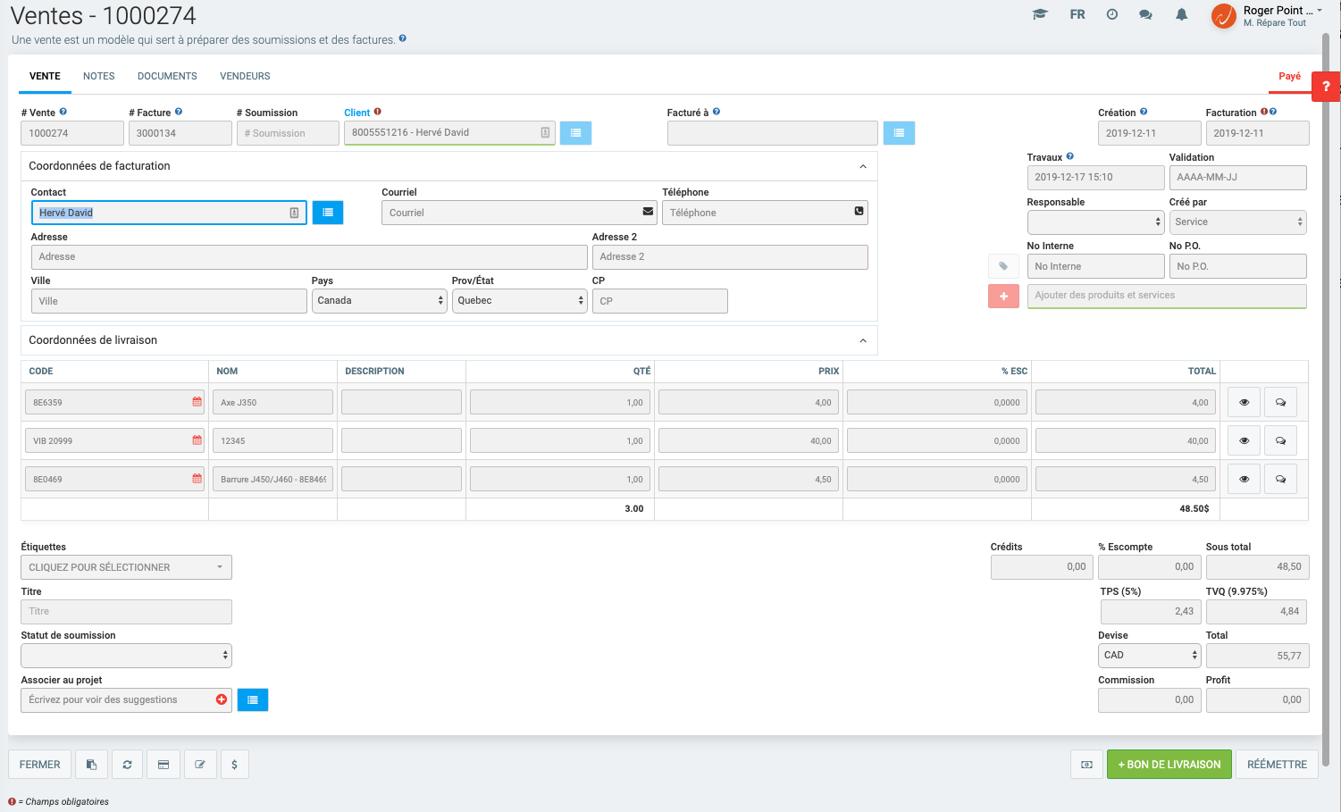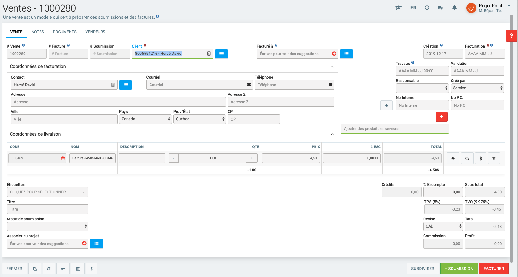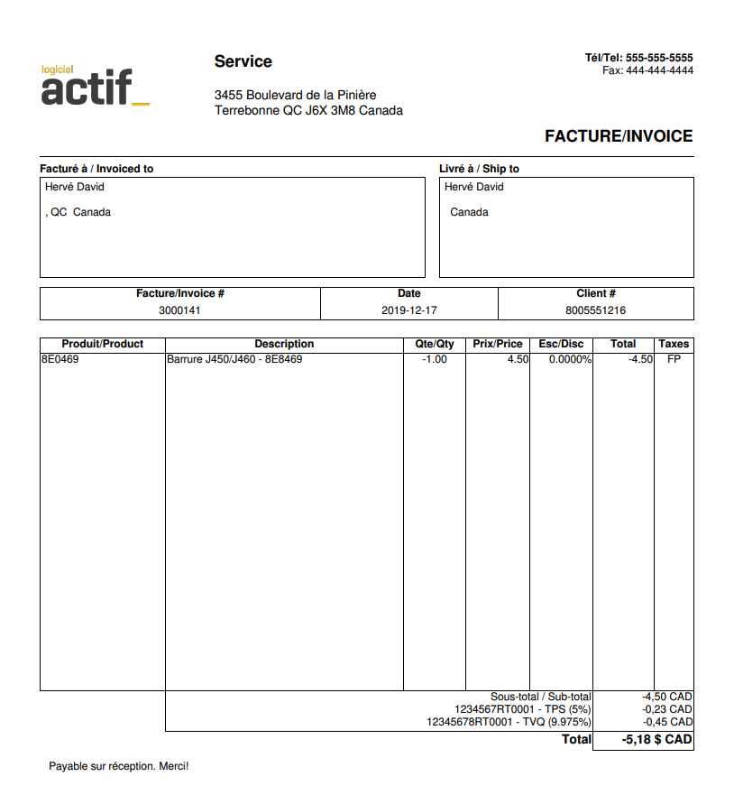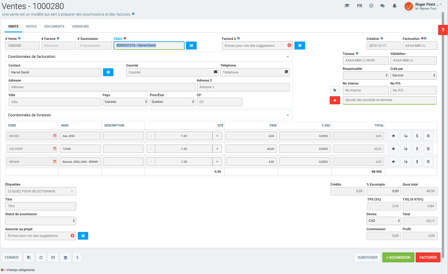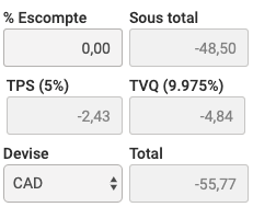 Tous les montants facturables figurant sur cette Vente seront par conséquent en négatif, de même que le Sous total, les taxes applicables et le Total.
