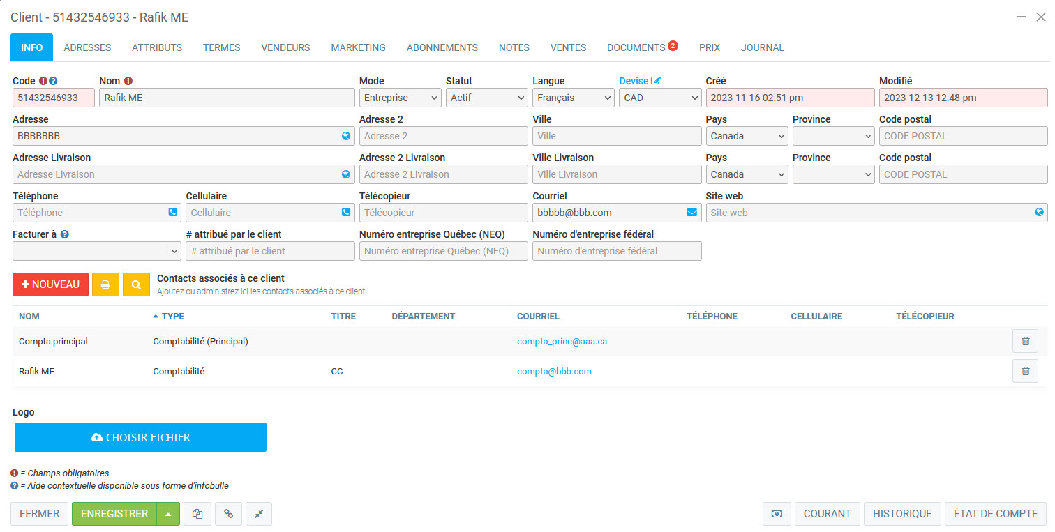 NOTE : Le mode de la fiche de ce client, doit être "Entreprise" pour pouvoir ajouter des "Contacts associés à ce client".