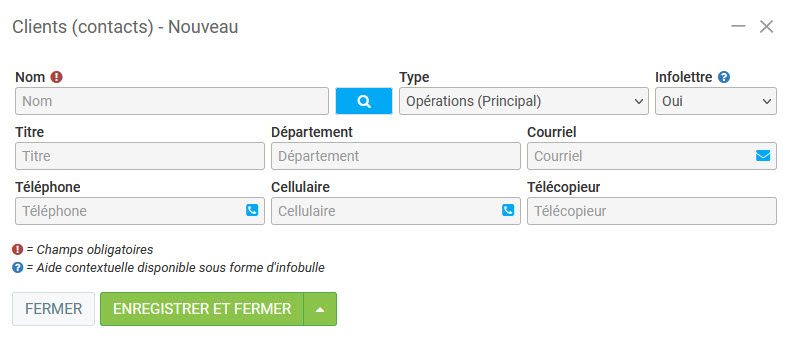 Remplir les champs : Nom, Infolettre (oui ou non, inclure le contact dans l'infolettre)Titre, Département (s'il y a lieu), Courriel, Téléphone (s'il y a lieu), Cellulaire (s'il y a lieu), Télécopieur (s'il y a lieu).