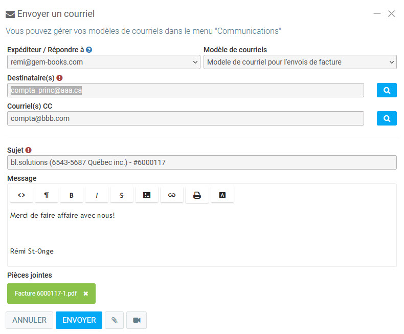 Dans certains cas, vous aurez besoin d'envoyer une facture ou une soumission, à deux contacts du même client automatiquement, à partir de GEM-BOOKS.