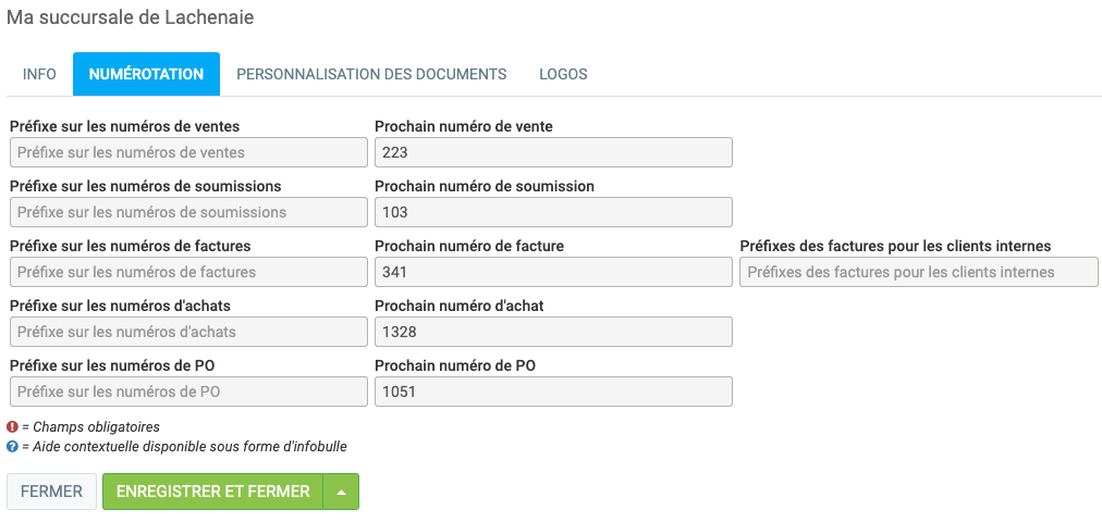 C'est dans l'onglet numérotation où vous pourrez définir votre dernier numéro de vente, de soumission, de facture, d'achats et de bon de commande.