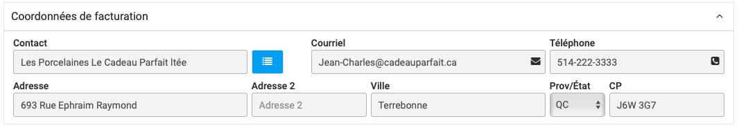 Cette section vous indique les coordonnées qui seront prises en considération au moment de l'émission de la facture. Elles proviennent de la fiche Client identifiée dans le champ "Client" ou dans le champ Facturé à, selon l'éventualité qui s'applique.