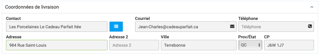 Cette section vous indique les coordonnées de l'emplacement où la livraison des marchandises devra être effectuée. Elles proviennent par défaut de la fiche client identifiée dans le champ "Client". Originalement, cette section vous apparaît sous sa forme contractée, telle que vous la voyez ci-dessus...