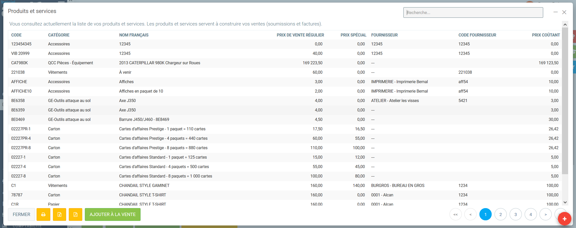 que vous trouverez facilement au centre, dans la partie de droite de la fiche "Vente". Ceci aura pour effet de vous amener à l'écran la liste complète de tous les Produits et services qui sont répertoriés dans votre base de données. Voici donc un aperçu de ce que vous aurez à l'écran...