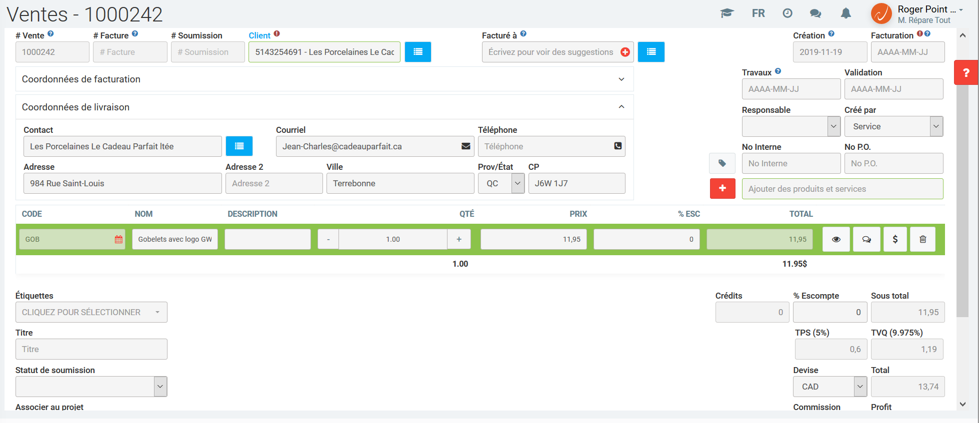 Ceci termine la création de votre fiche "Vente". À ce stade-ci, vous êtes maintenant prêt à créer une soumission ou encore directement passer à la création de la facture, puisque l'étape de la soumission est à 100 % optionnelle.