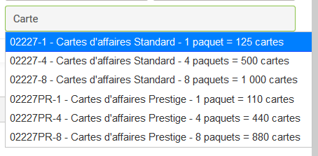 Dans le cas présent, nous supposerons que votre client souhaite acheter 125 cartes professionnelles régulières pour l'acheteur , puis 1 000 cartes régulières pour un représentant de l'entreprise et finalement, 440 cartes de luxe pour le président. Nous inscrirons donc simplement "carte" dans le champ de recherche et laisserons GEM-BOOKS nous proposer une liste de tous les items de la base de données des Produits et services dans lesquels se retrouve ce mot ...