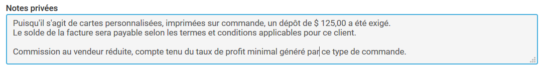 Vous trouverez ci-dessous un exemple des notes privées pouvant se retrouver sur une fiche "Vente"...