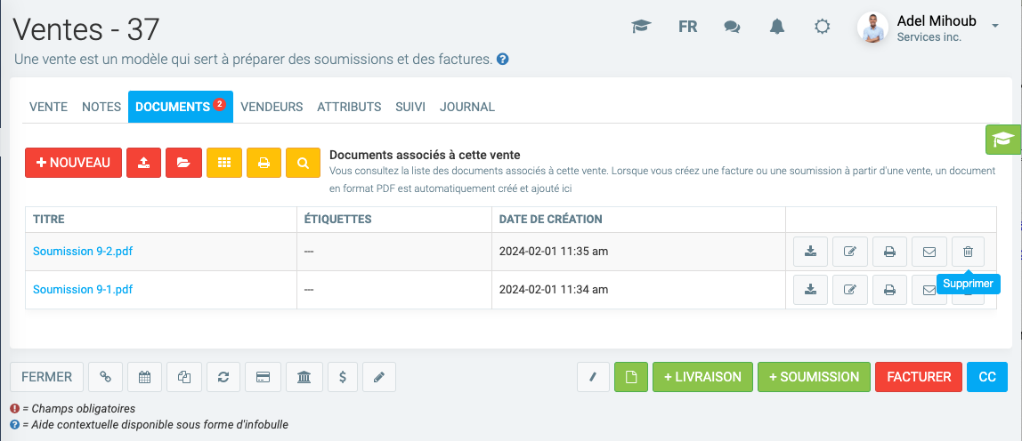 (Notez que pour les besoins de l'exemple, nous avons tiré la capture d'écran depuis une autre fiche "Vente", pour laquelle des soumissions ont précédemment été générées, de même que la facture).
