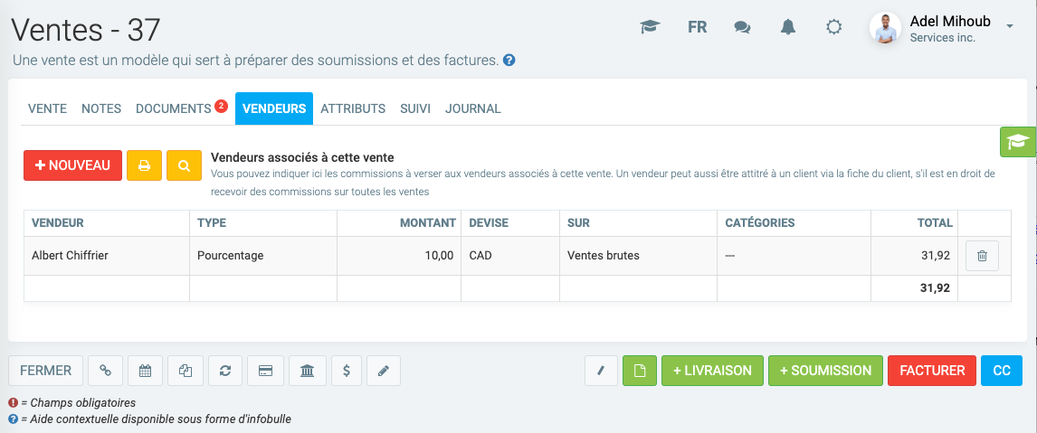 Dans le cas d'une vente partagée (pour laquelle plus d'un vendeur est redevable d'une commission), tous les vendeurs concernés devront être inscrits à partir de cet onglet de la fiche "Vente".