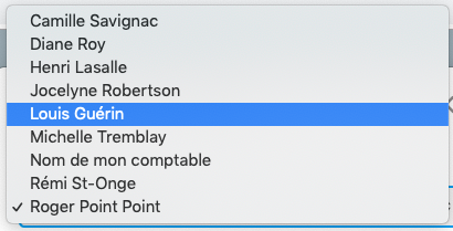 , on nous offrira la liste des personnes auxquelles une commission peut possiblement être payable pour cette vente. Notez que dans le cas présent, le nom de Roger Point Point était sélectionné par défaut, puisque la session en cours a été ouverte sous son nom d'utilisateur.