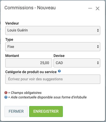 est optionnel et permet de créer une condition dans le calcul de la commission payable. Par exemple, dans le cas spécifique où le vendeur désigné plus haut aurait droit à une commission uniquement sur la catégorie de Produits et services qui serait identifiée dans ce champ. Si aucune restriction de ce tyne n'est applicable, ce champ devra demeurer vide.
