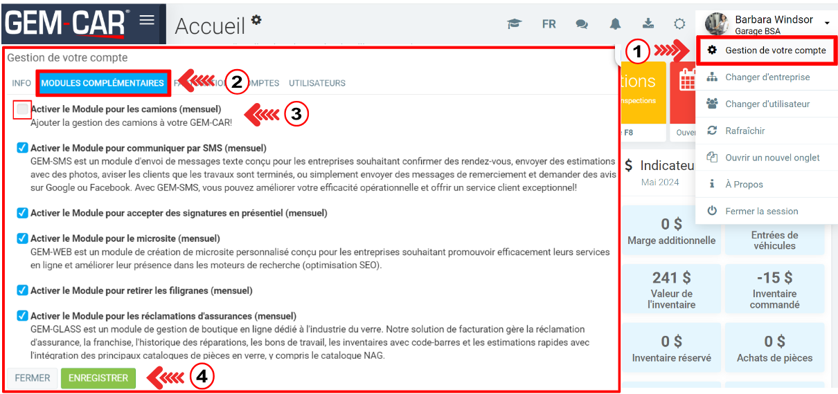 Cliquez en haut à droite, à côté du nom du garage et de l'utilisateur, et ouvrez l'option Gestion de votre compte.