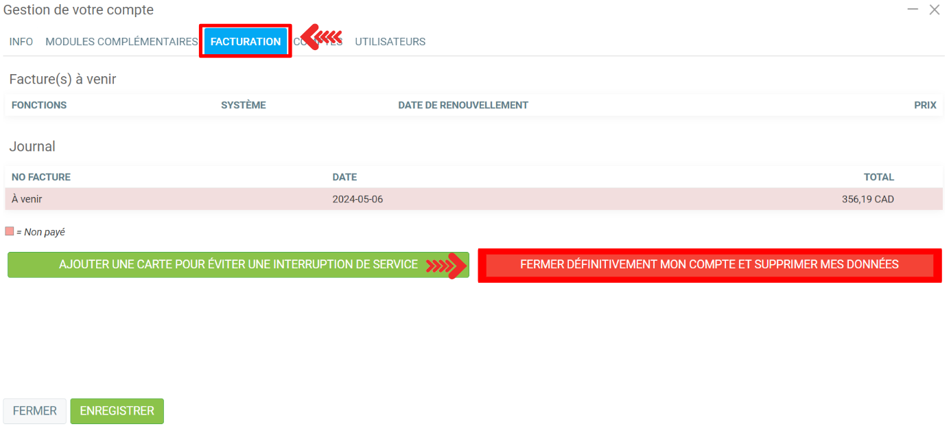 Il est également possible de fermer votre compte. Dans l'onglet Facturation, vous avez les options ''Ajouter une carte pour éviter une interruption de service'' et ''Fermer définitivement mon compte et supprimer mes données''.