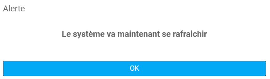 Si l'une des deux premières options est sélectionnée, une boîte d'alerte s'ouvre avec le message: ''Le système va maintenant se rafraichir''.